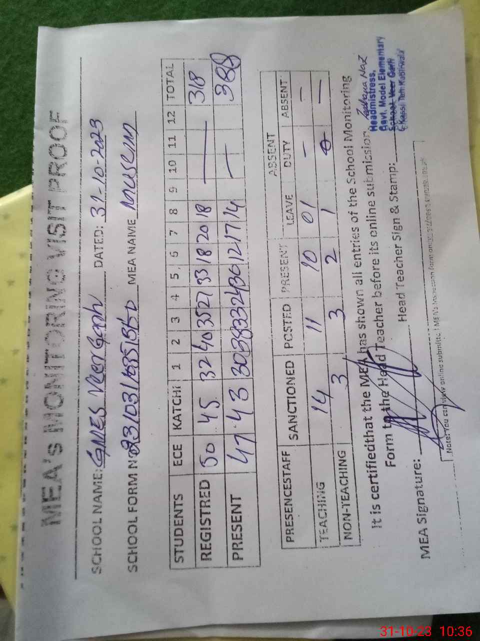 | Attendance Register | Head Teacher | MEA with School | Visit Proof |