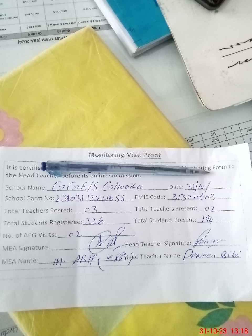 | Attendance Register | Head Teacher | MEA with School | Visit Proof |