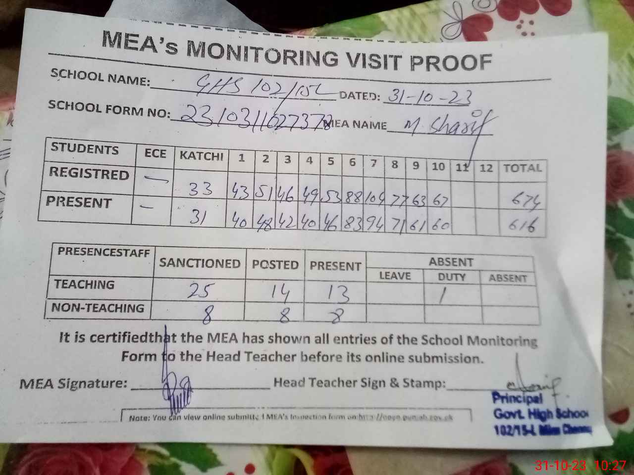 | Attendance Register | Head Teacher | MEA with School | Visit Proof |