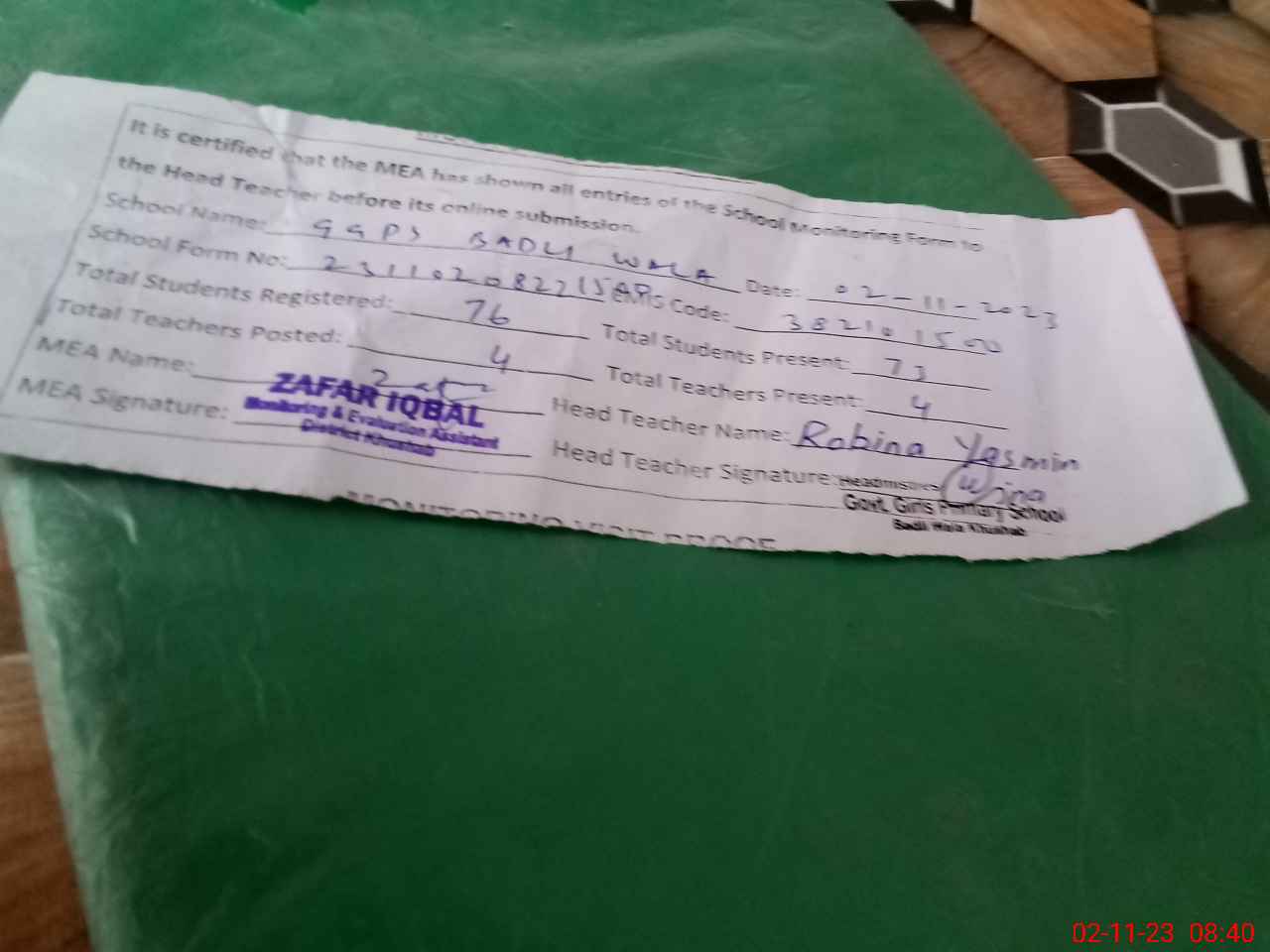 | Attendance Register | Head Teacher | MEA with School | Visit Proof |