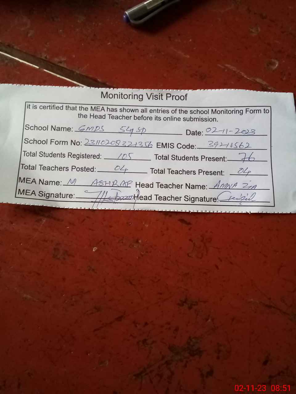 | Attendance Register | Head Teacher | MEA with School | Visit Proof |