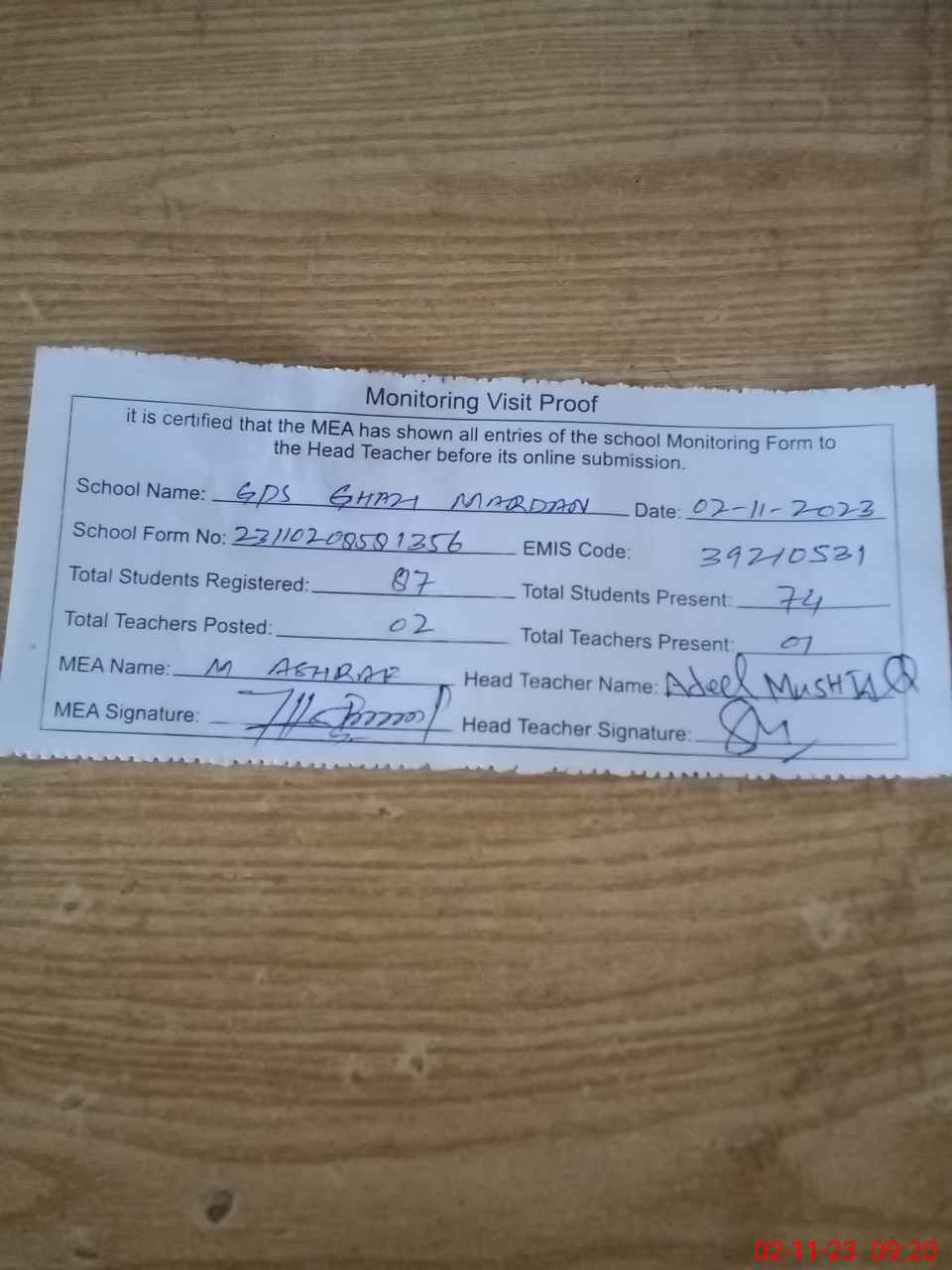 | EMIS Code: 39210531 | Name of School: GPS GHAZI MARDAN P/O CHAK BEDI | |||