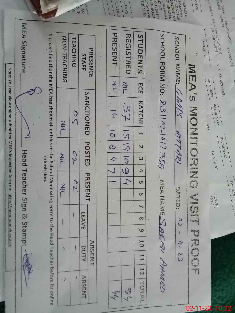 | Attendance Register | Head Teacher | MEA with School | Visit Proof |