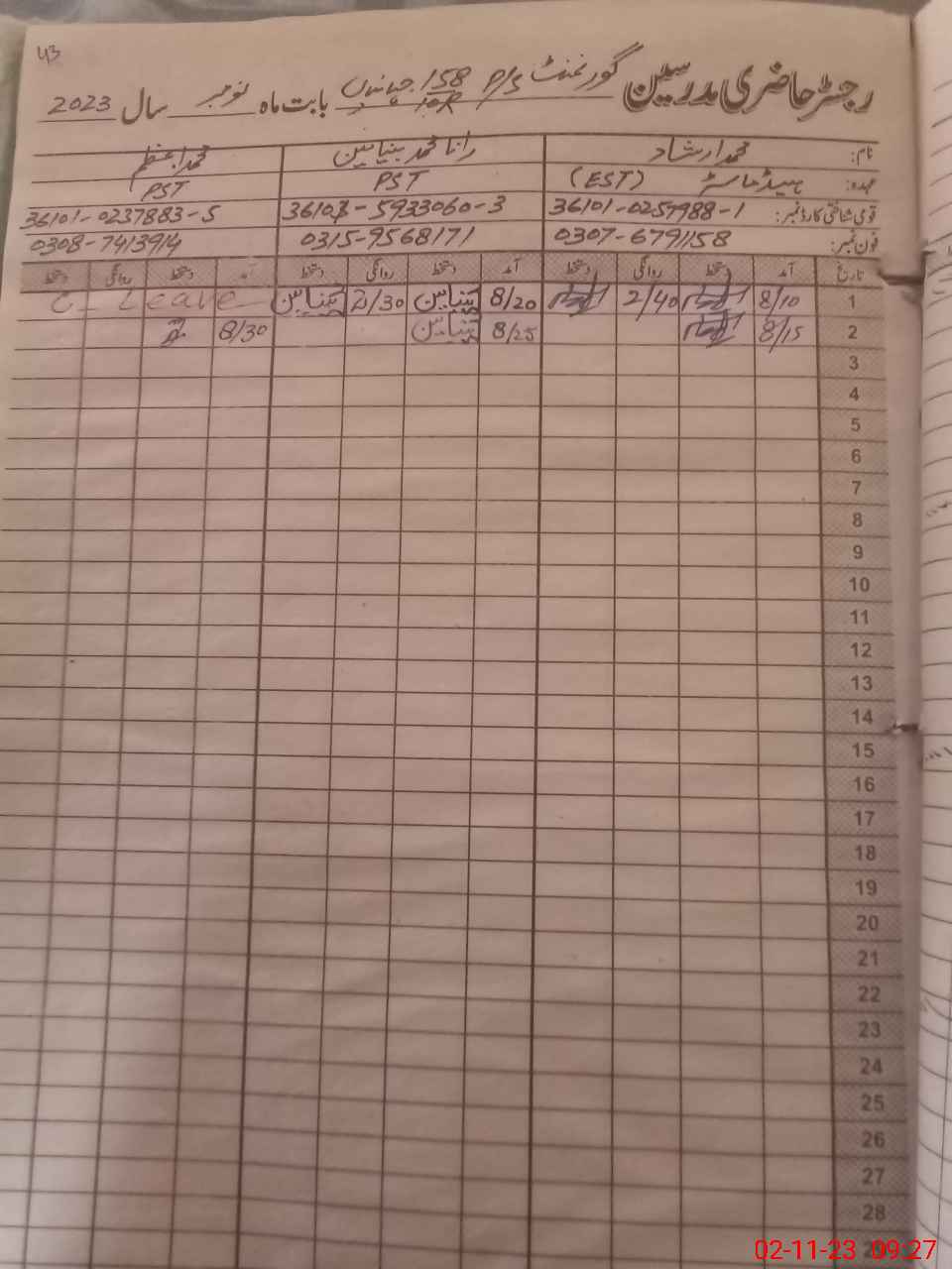 | Name: Mu**** Ir**** Designation: (School Headmaster's/Headmistress's) EST(G) Phone/Cell Number: 03**** |