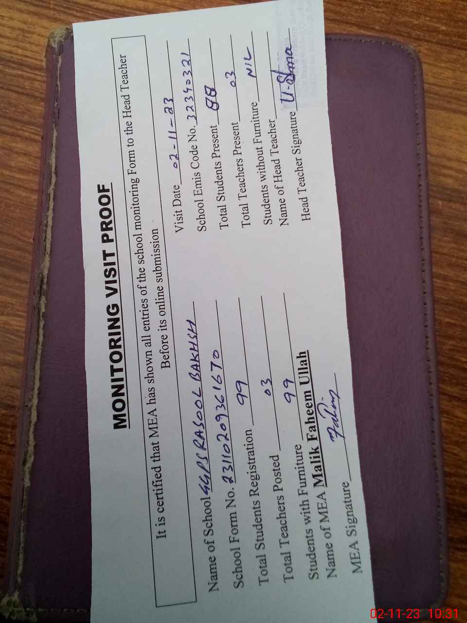 | Attendance Register | Head Teacher | MEA with School | Visit Proof |