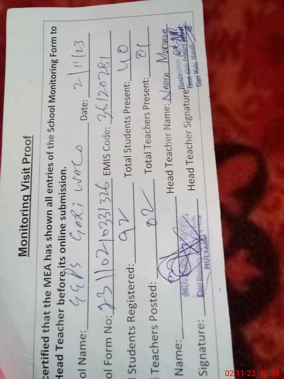 | EMIS Code: 36120281 | Name of School: GGPS GARI WALA SHUJABAD | |||
