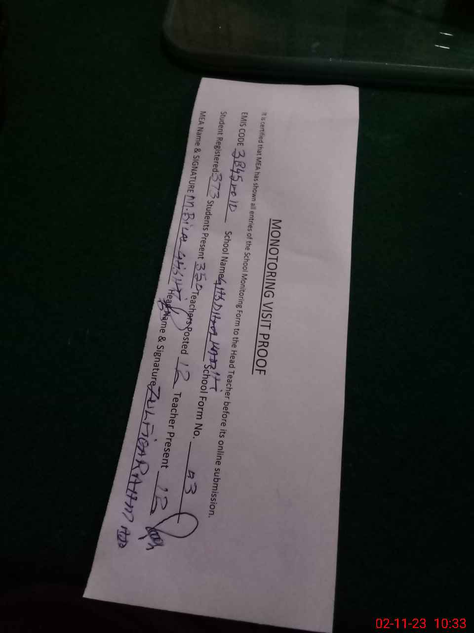 | Attendance Register | Head Teacher | MEA with School | Visit Proof |