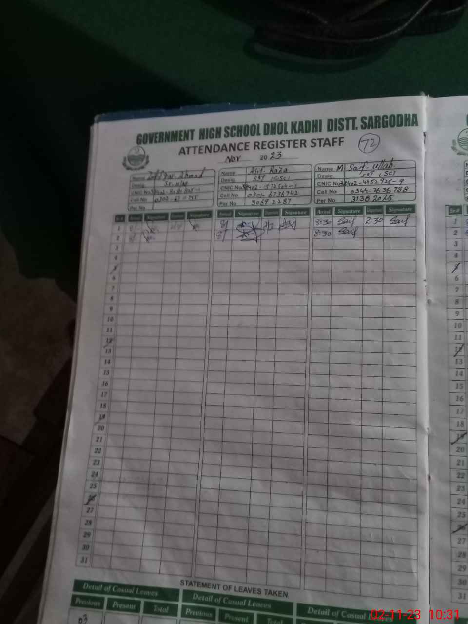 | CNIC | Full Name | Designation | R/C | Absence During Last Calender Month |