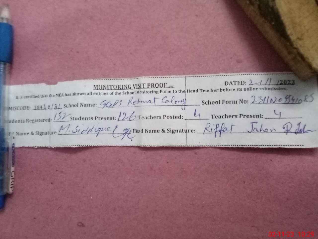 | Attendance Register | Head Teacher | MEA with School | Visit Proof |