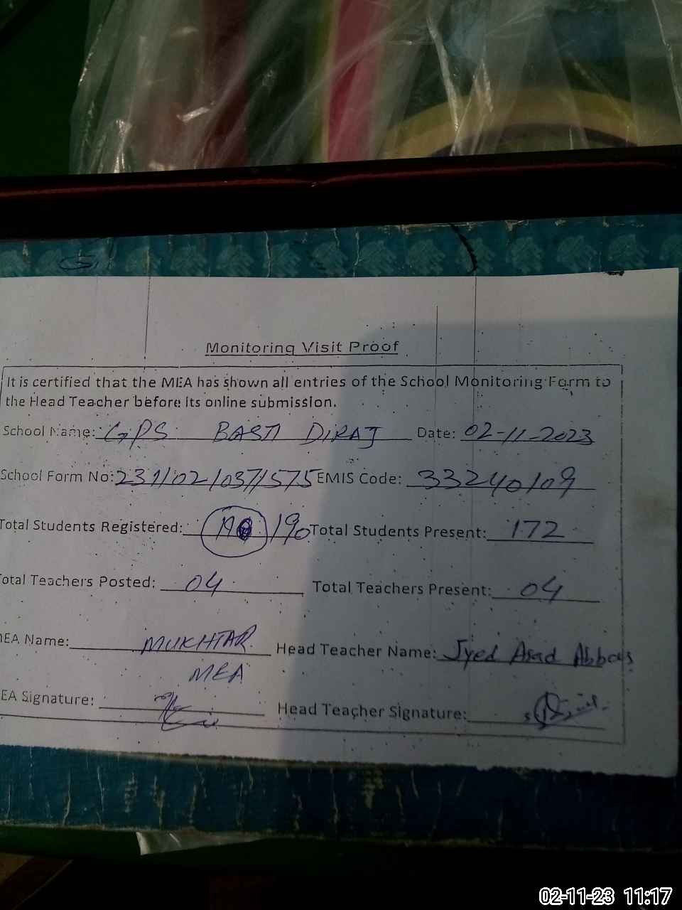 | Attendance Register | Head Teacher | MEA with School | Visit Proof |