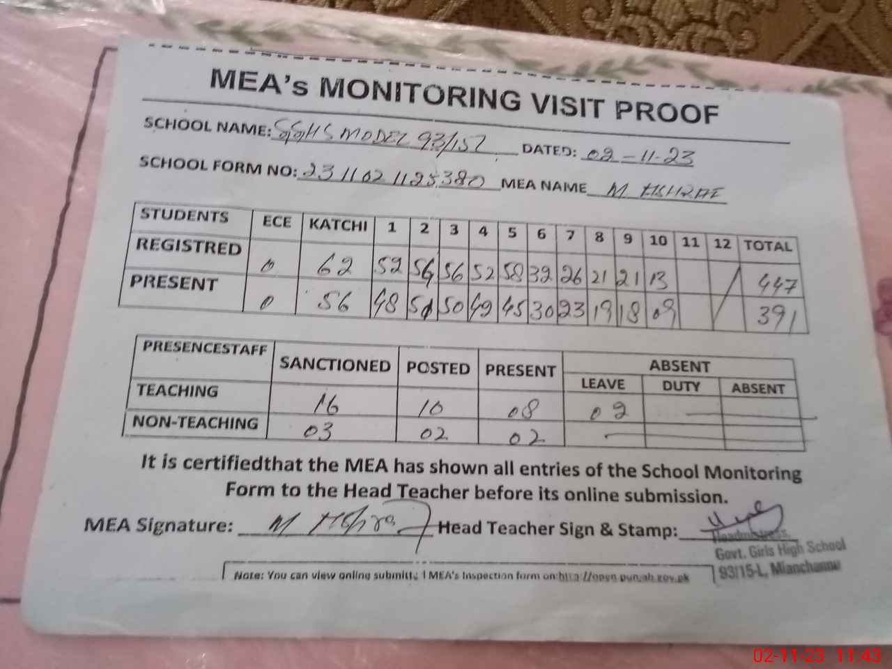 | EMIS Code: 36430089 | Name of School: GGHS MODEL 93/15-L, MIAN CHANNU | |||