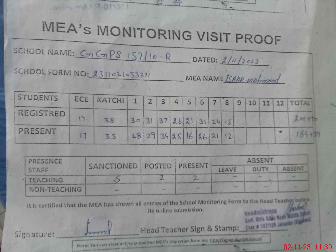 | Attendance Register | Head Teacher | MEA with School | Visit Proof |