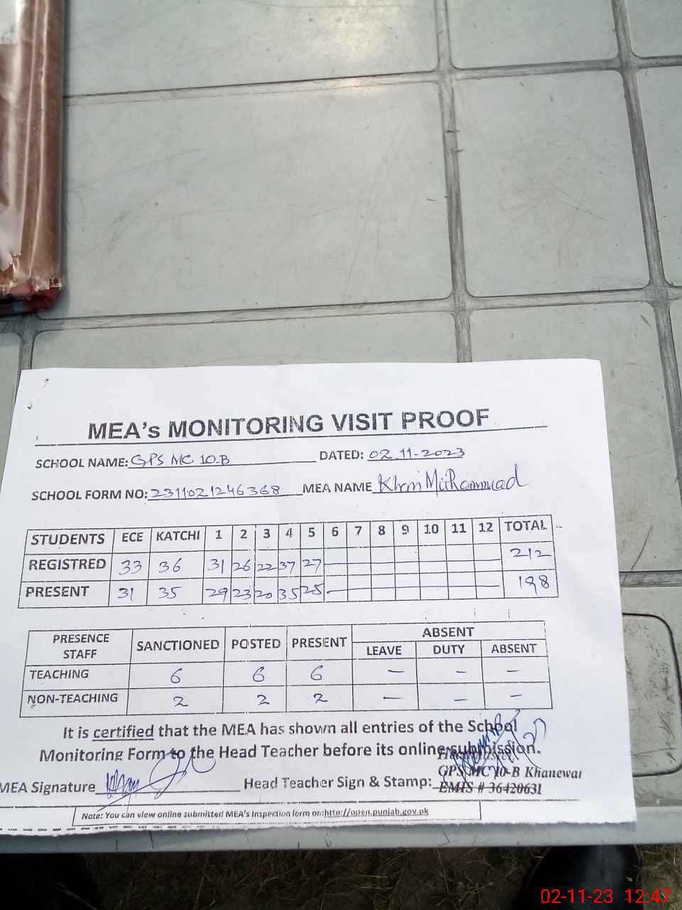 | Attendance Register | Head Teacher | MEA with School | Visit Proof |