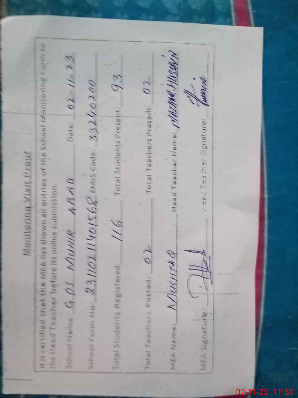 | Attendance Register | Head Teacher | MEA with School | Visit Proof |