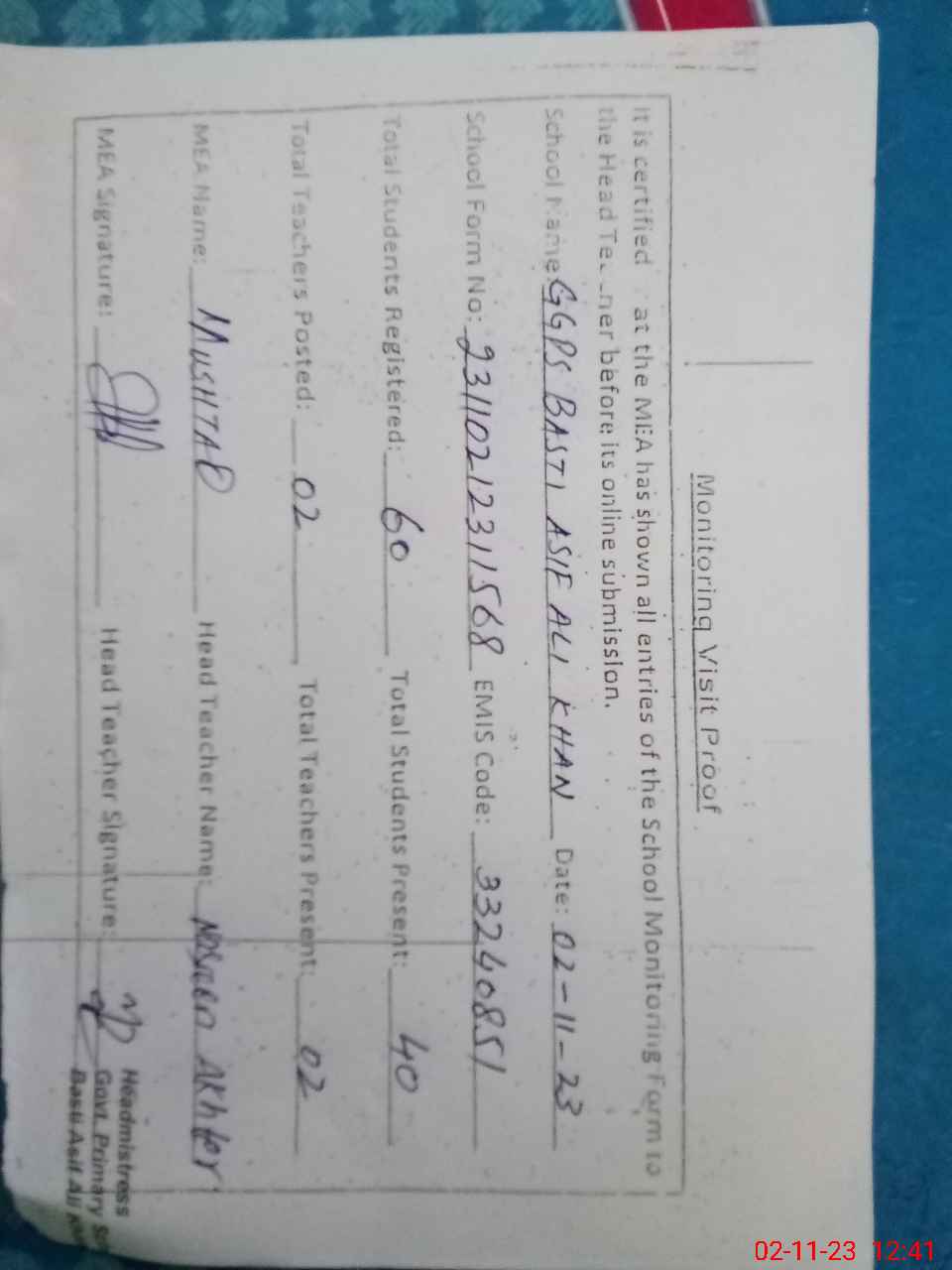 | Attendance Register | Head Teacher | MEA with School | Visit Proof |