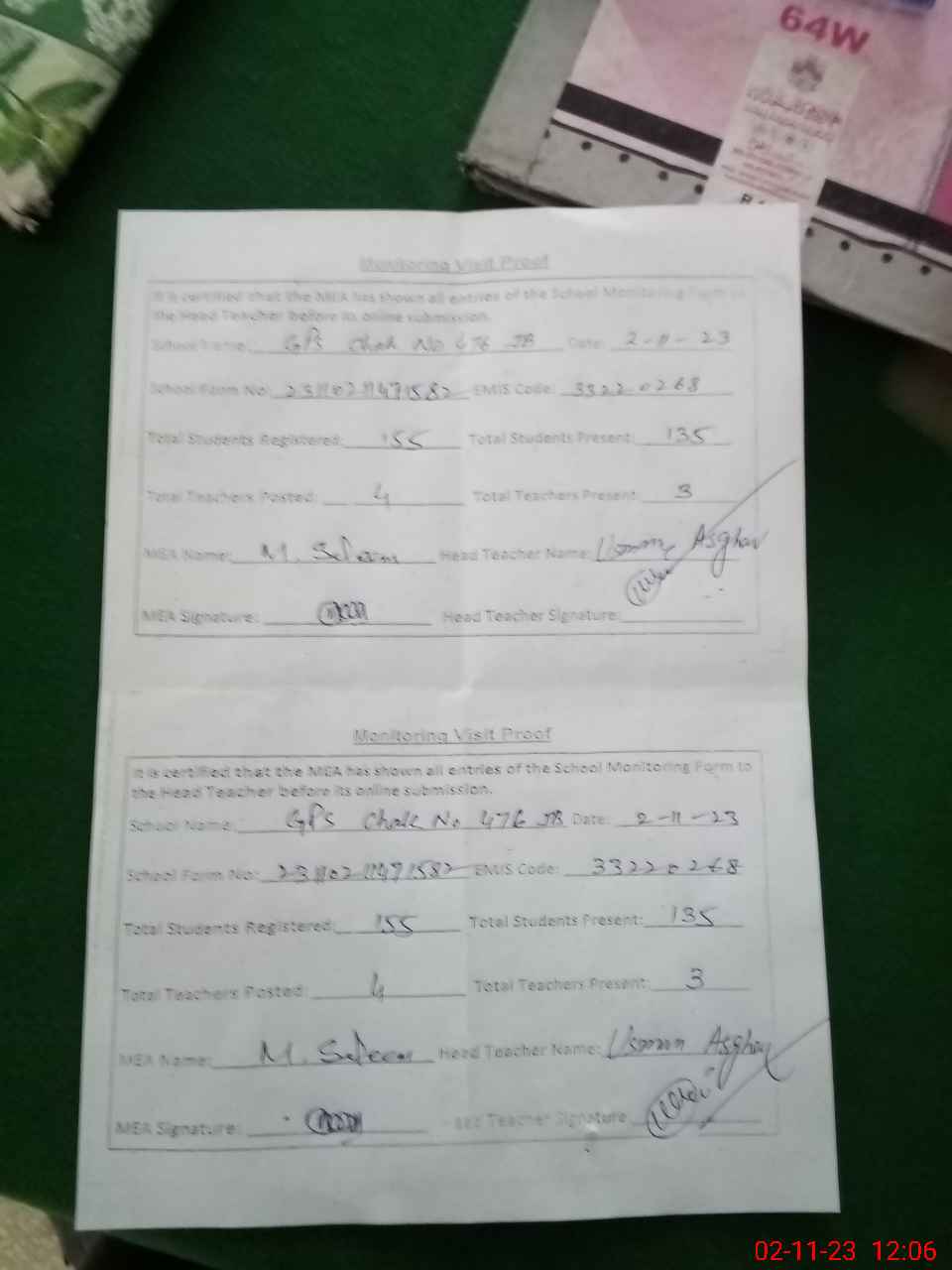 | Attendance Register | Head Teacher | MEA with School | Visit Proof |