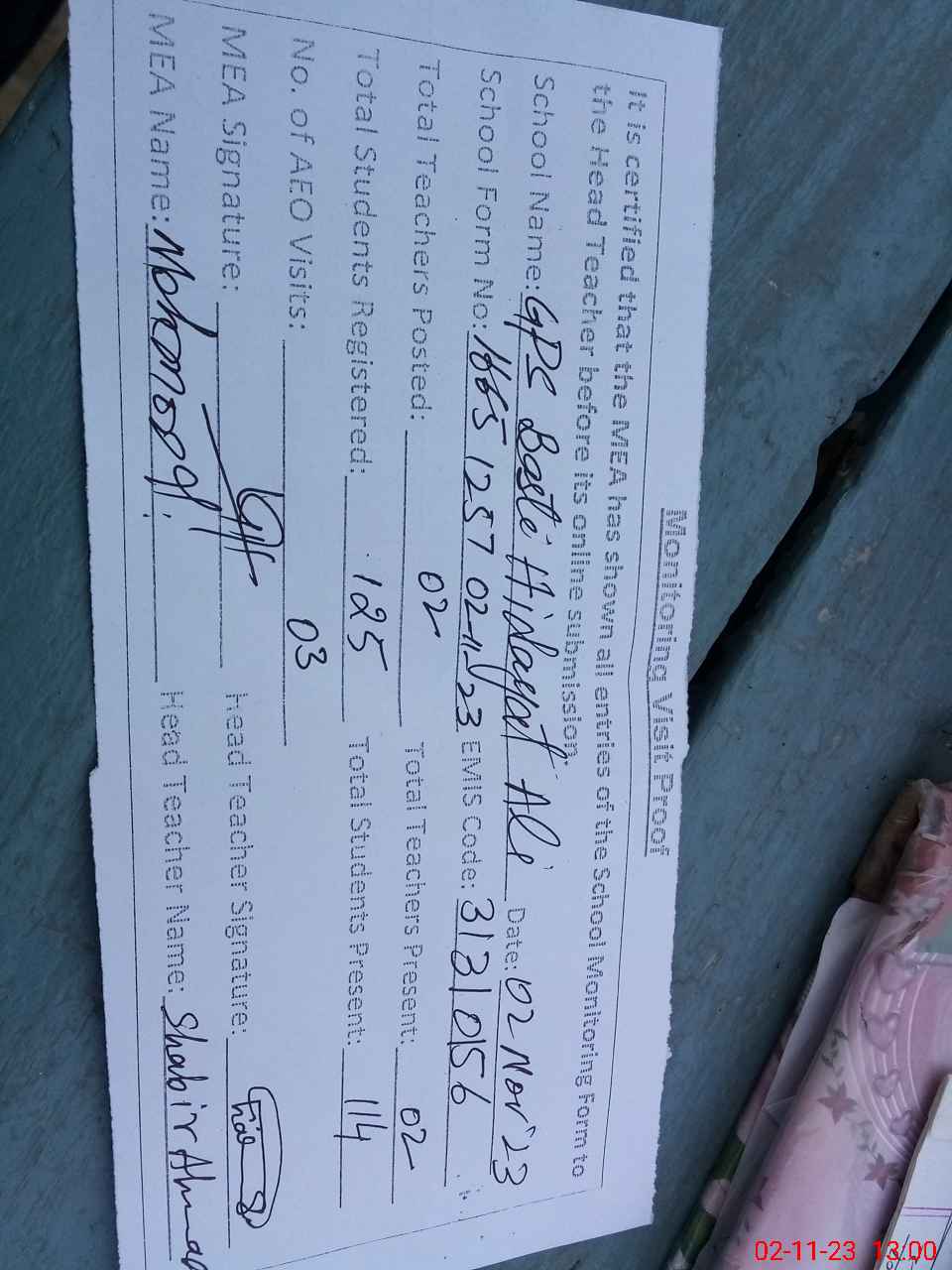 | Attendance Register | Head Teacher | MEA with School | Visit Proof |