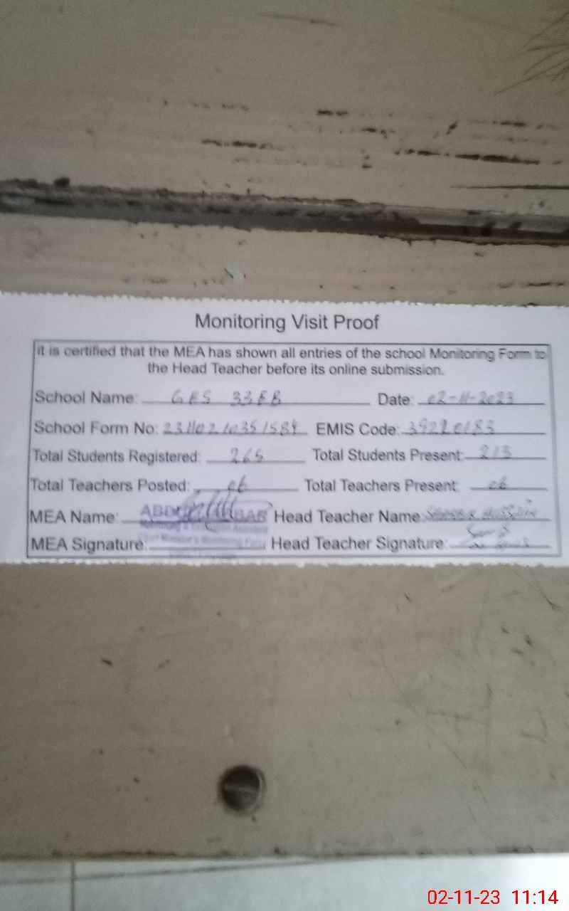 | Attendance Register | Head Teacher | MEA with School | Visit Proof |