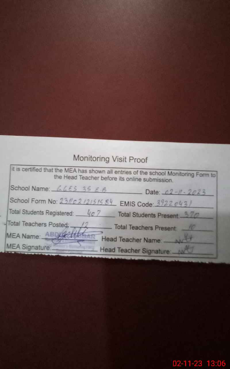 | Attendance Register | Head Teacher | MEA with School | Visit Proof |