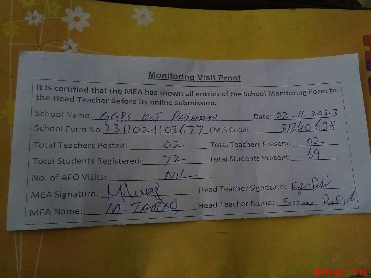 | Attendance Register | Head Teacher | MEA with School | Visit Proof |