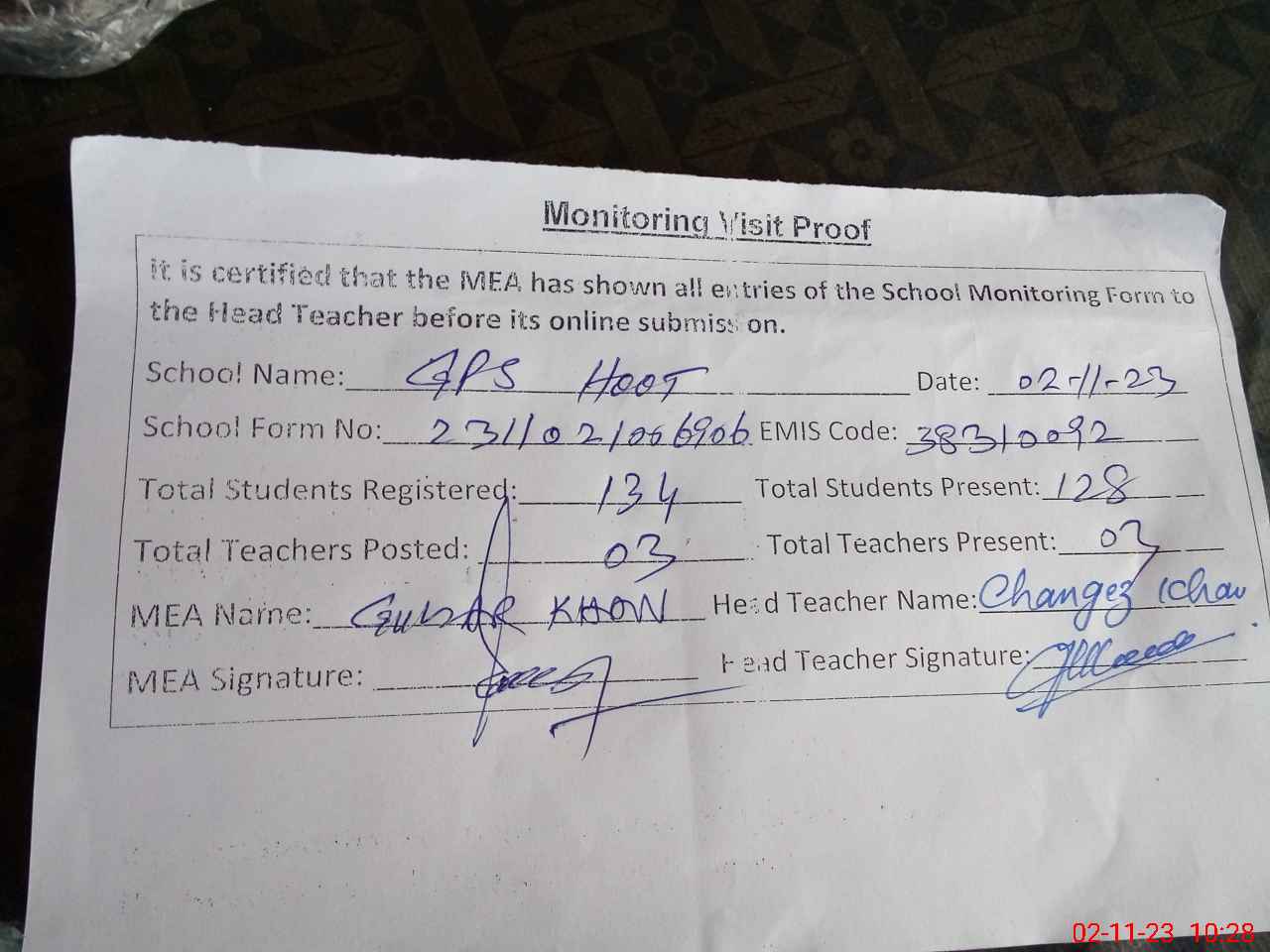 | Monitoring Date: 02-11-2023 | Start Time: 02-11-2023 10:06 AM | End Time: 02-11-2023 10:34 AM | Name of MEA: Gu**** Hu**** Kh**** | |