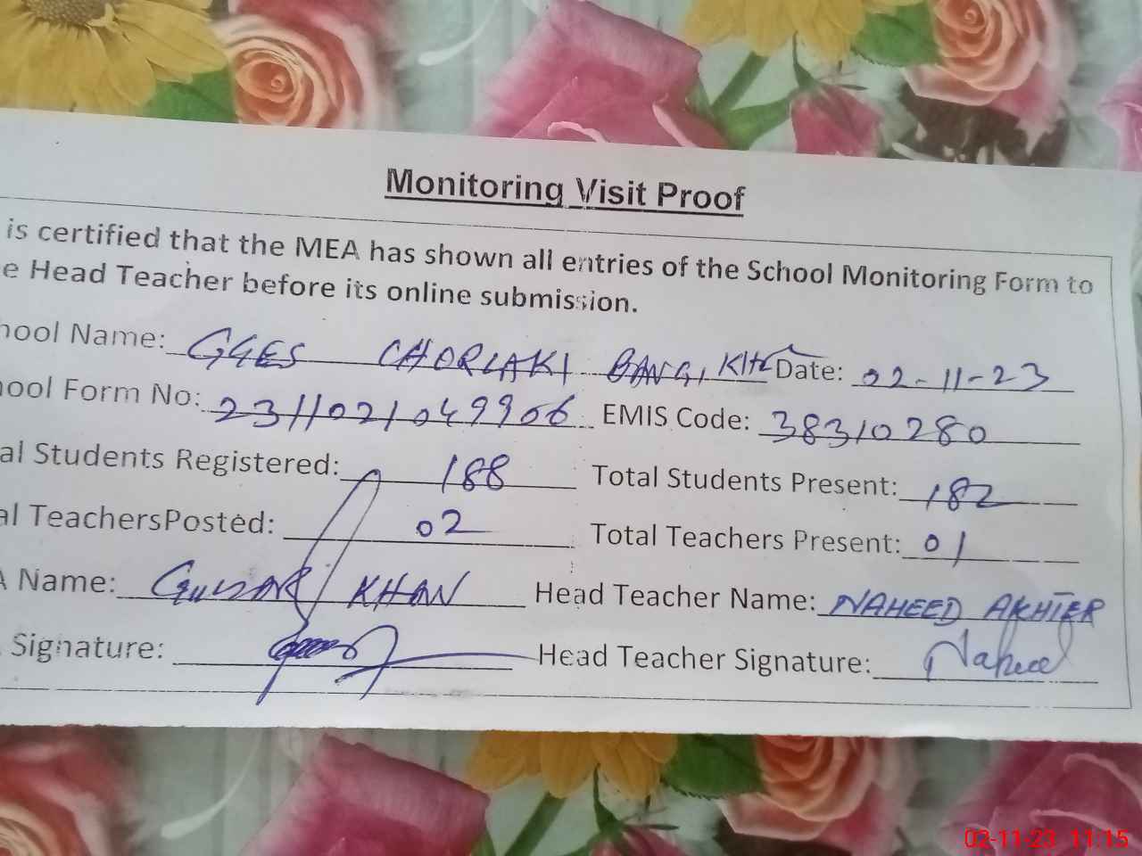 | Attendance Register | Head Teacher | MEA with School | Visit Proof |