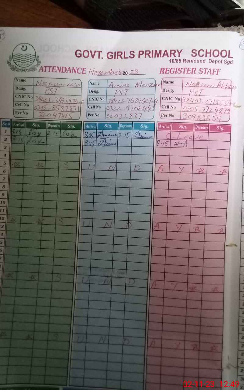 | CNIC | Full Name | Designation | R/C | Absence During Last Calender Month |