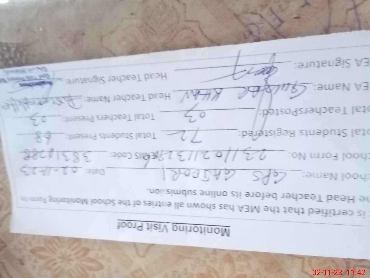 | Attendance Register | Head Teacher | MEA with School | Visit Proof |