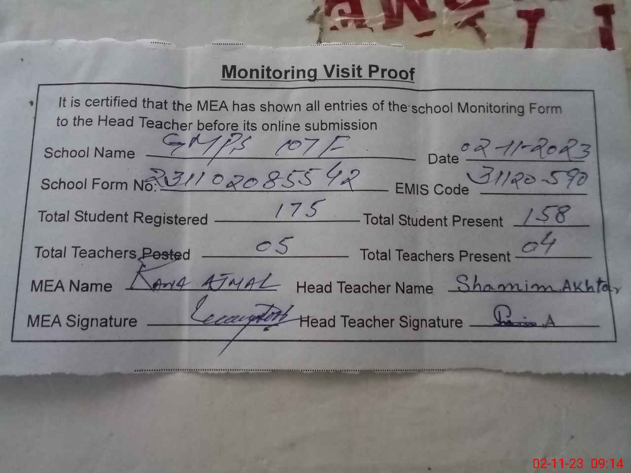 | EMIS Code: 31120590 | Name of School: GMPS CHAK NO. 107/F | |||