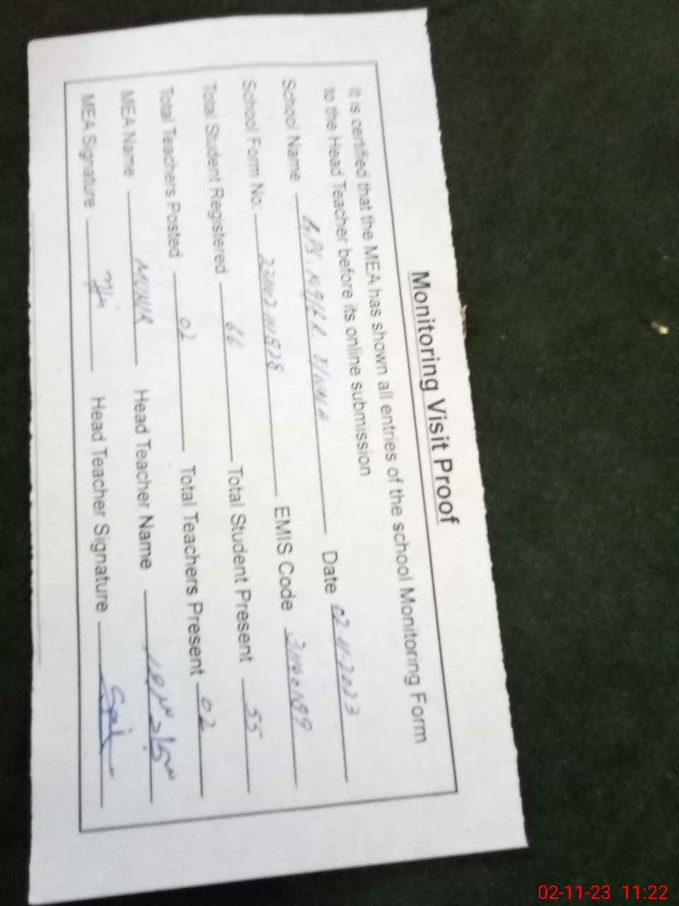 | Attendance Register | Head Teacher | MEA with School | Visit Proof |