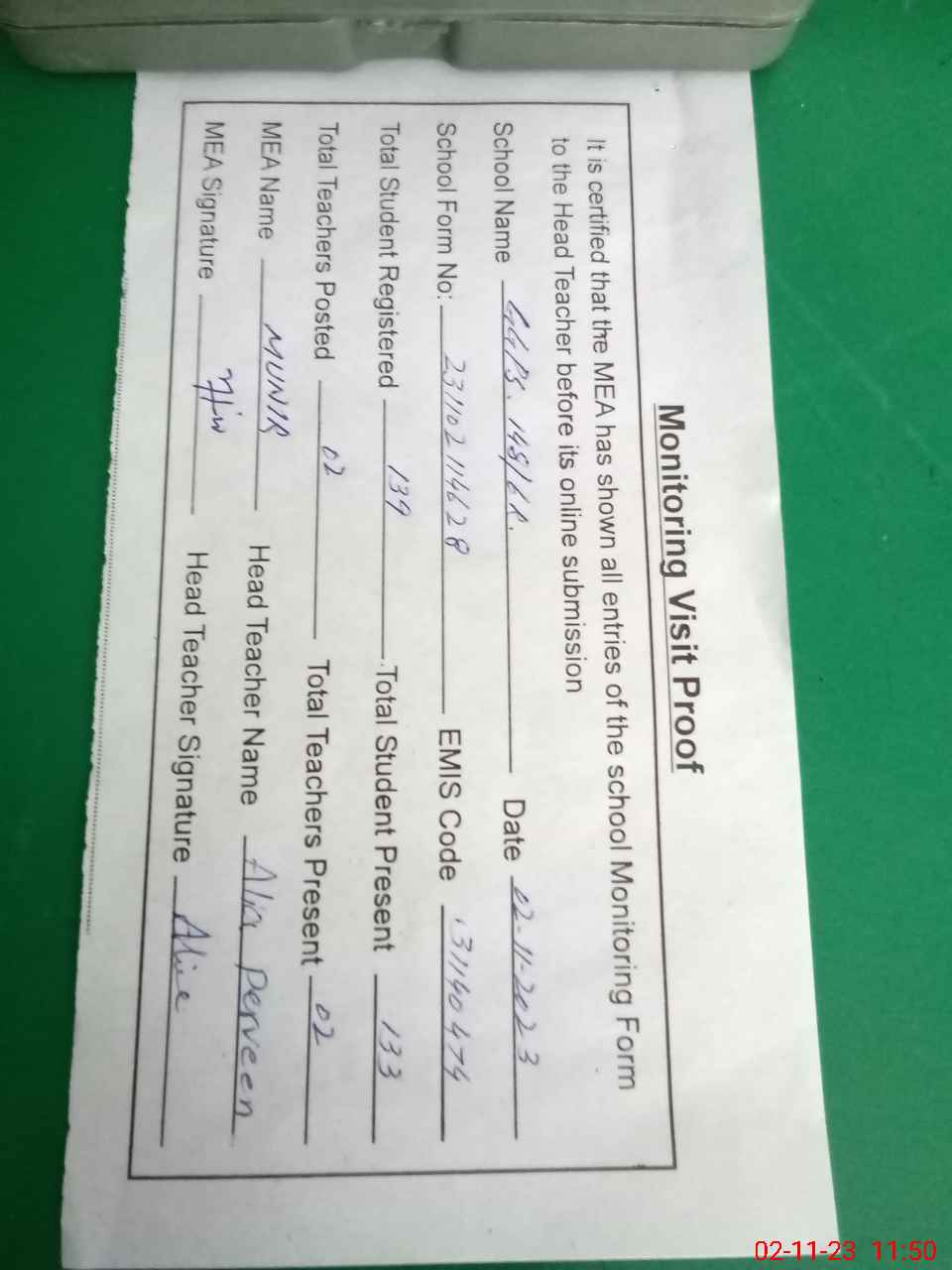 | Attendance Register | Head Teacher | MEA with School | Visit Proof |