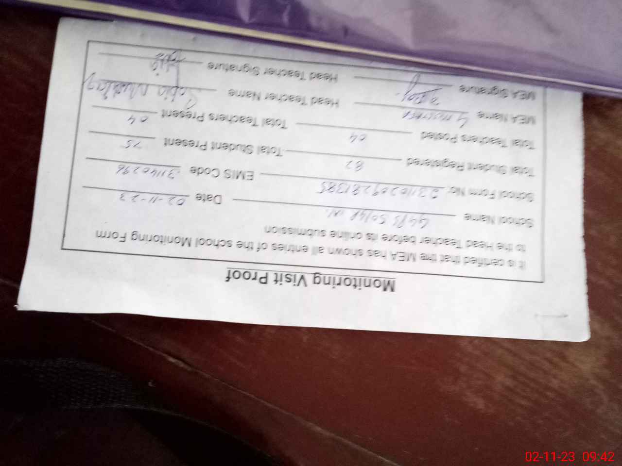 | Attendance Register | Head Teacher | MEA with School | Visit Proof |