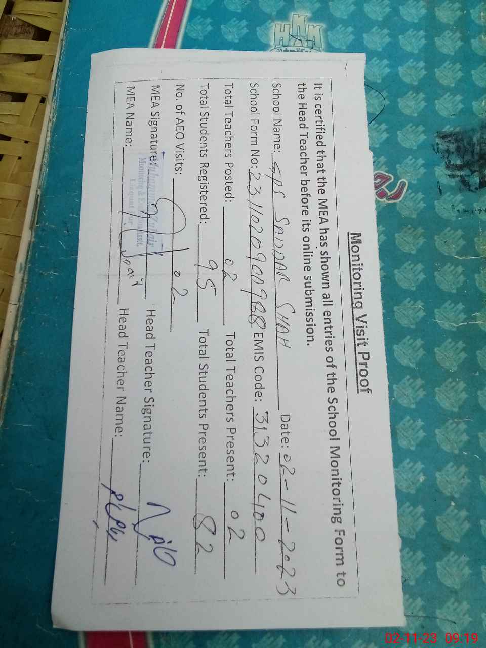 | EMIS Code: 31320400 | Name of School: GPS SADDAR SHAH | |||