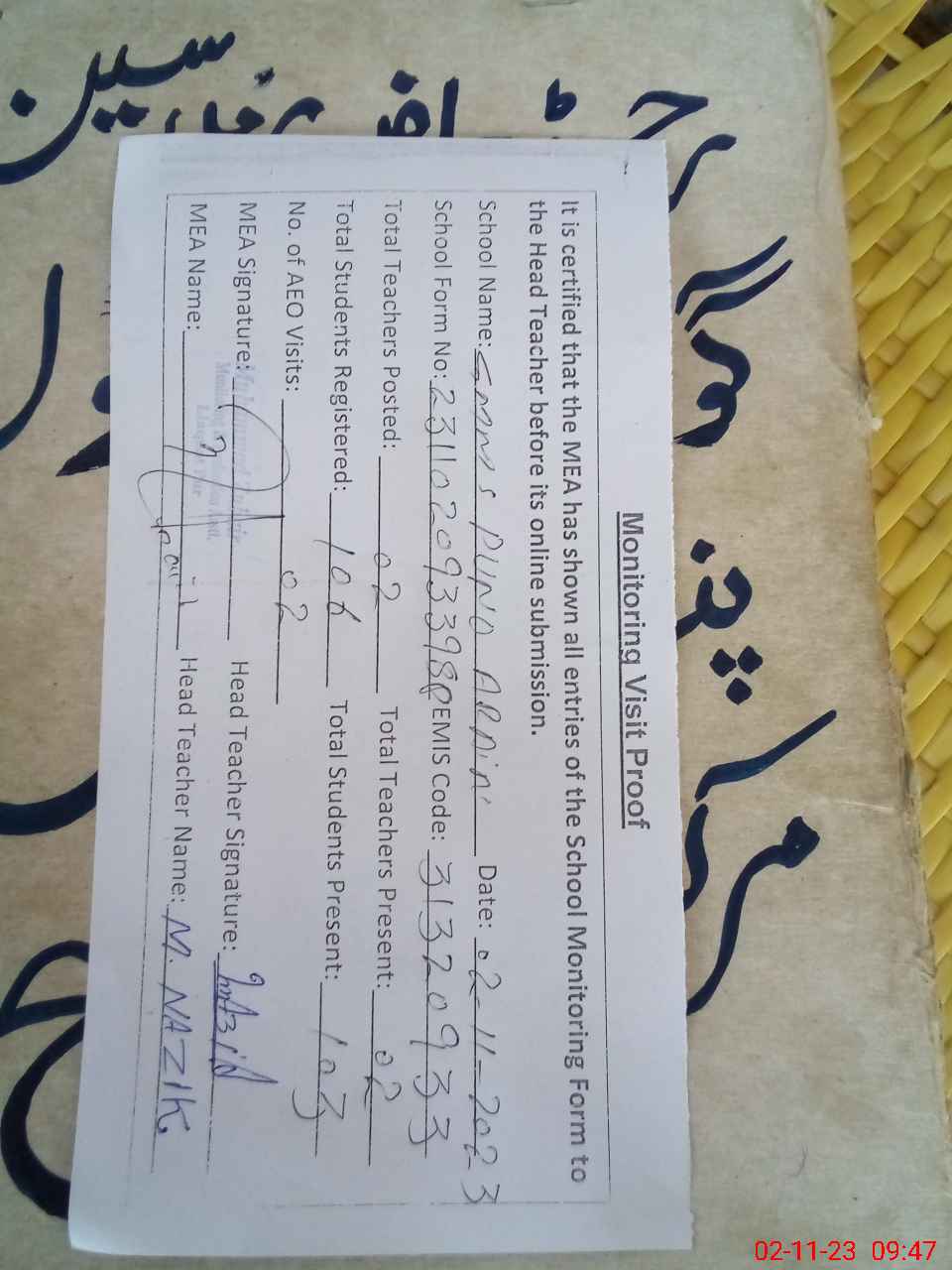 | EMIS Code: 31320933 | Name of School: GPS PUNU ARAIN | |||