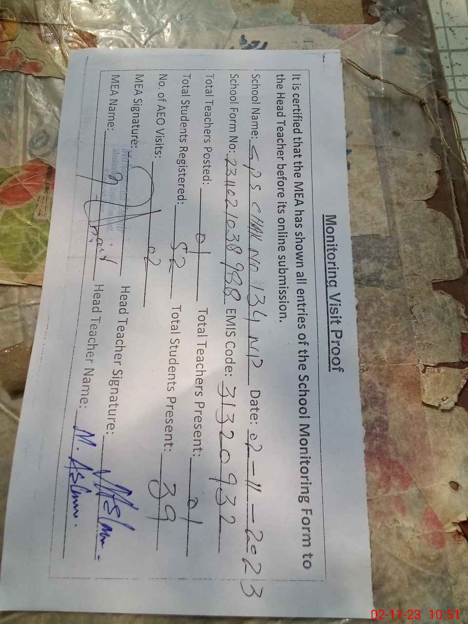 | EMIS Code: 31320932 | Name of School: GPS CHAK NO. 134/NP | |||