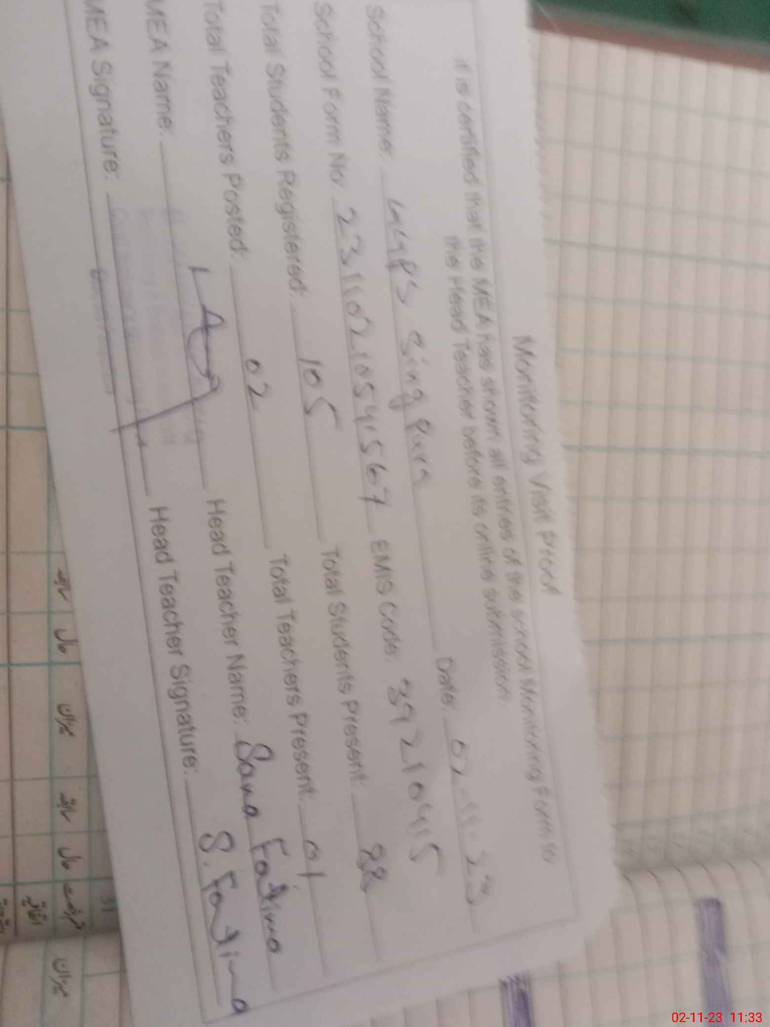 | Attendance Register | Head Teacher | MEA with School | Visit Proof |