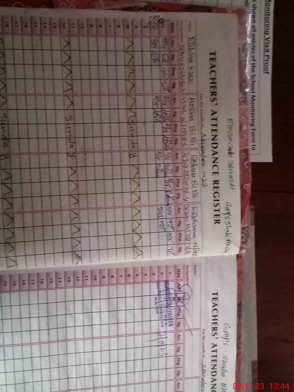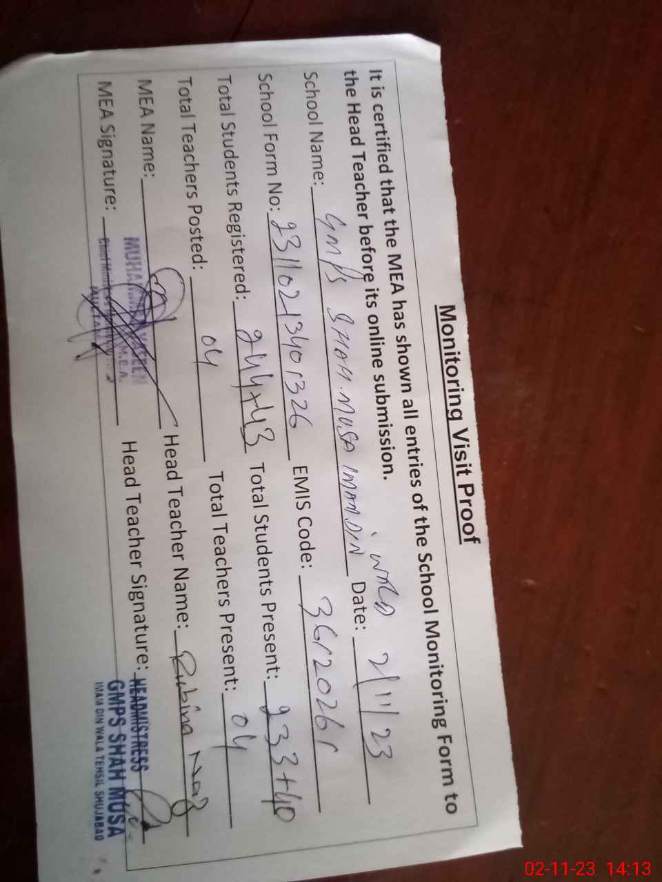 | Attendance Register | Head Teacher | MEA with School | Visit Proof |