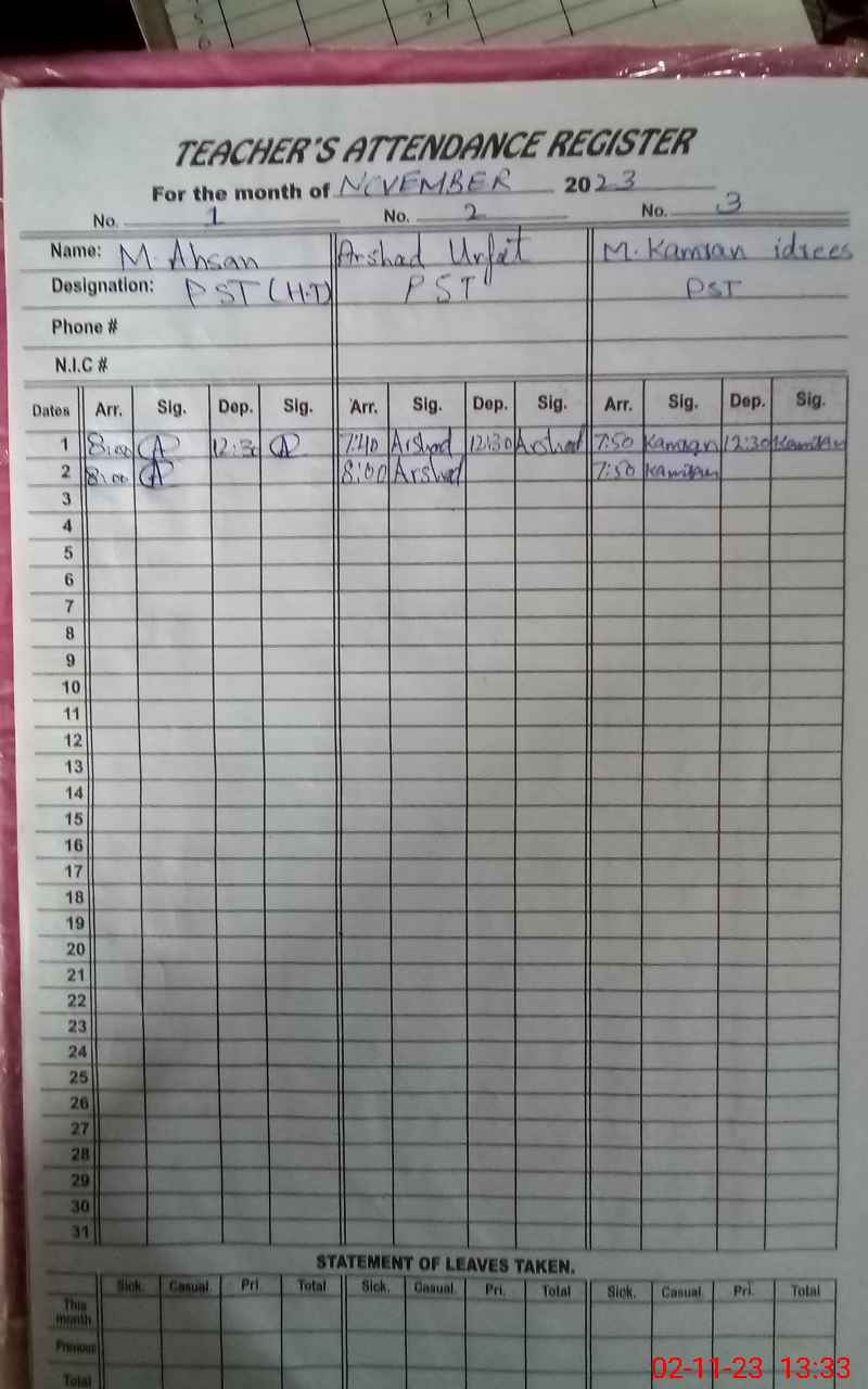 | CNIC | Full Name | Designation | R/C | Absence During Last Calender Month |