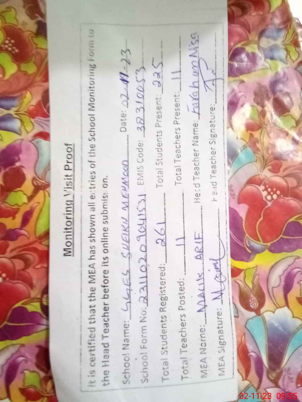 | Attendance Register | Head Teacher | MEA with School | Visit Proof |