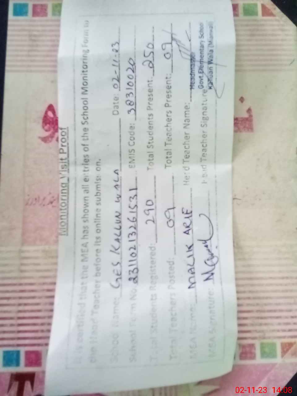 | Attendance Register | Head Teacher | MEA with School | Visit Proof |