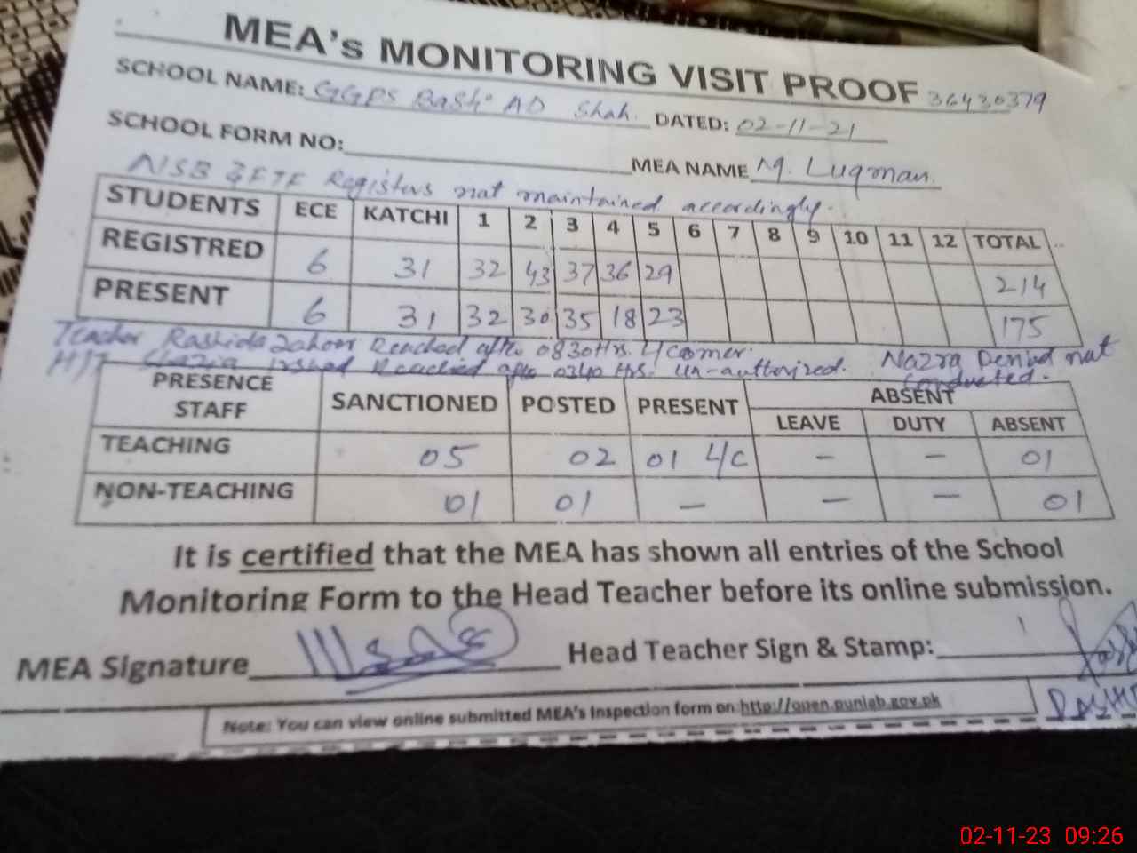 | Remarks (Use Separate Page if Required): NSB and FTF records was not maintained accordingly Rashida zahoor was late comer reached after 0830hrs Shazia Irshad head teacher reached after 0840hrs | |||||