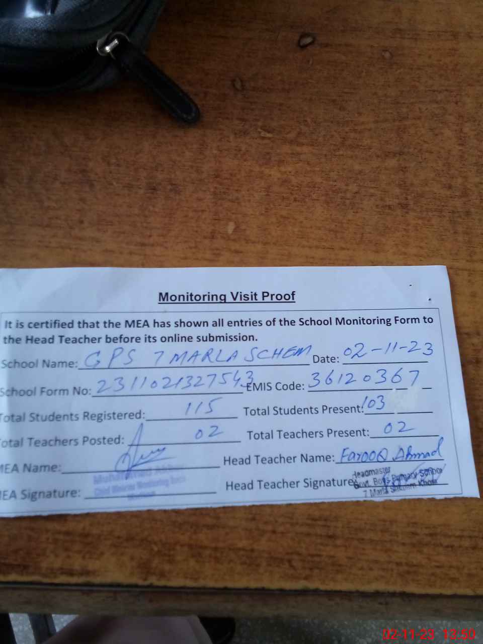 | Attendance Register | Head Teacher | MEA with School | Visit Proof |