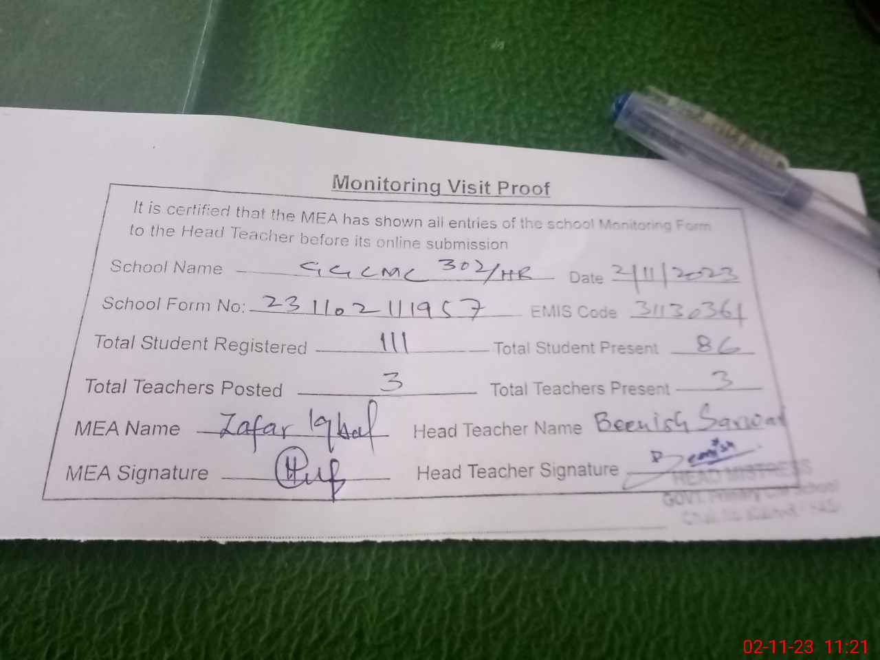 | Monitoring Date: 02-11-2023 | Start Time: 02-11-2023 11:00 AM | End Time: 02-11-2023 11:22 AM | Name of MEA: Za**** Iq**** BN**** | |