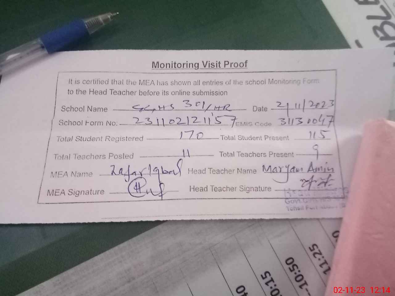 | Attendance Register | Head Teacher | MEA with School | Visit Proof |