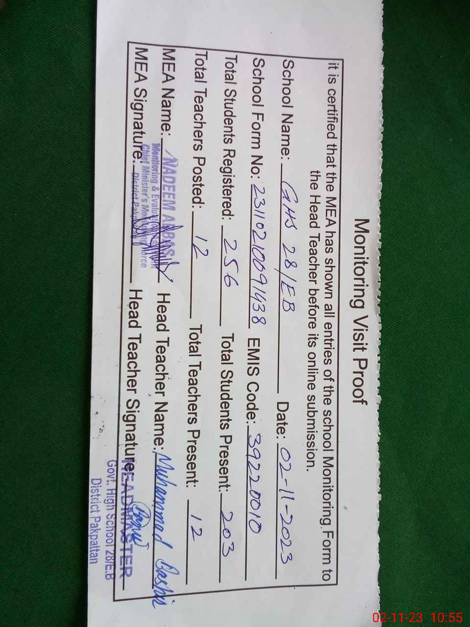 | EMIS Code: 39220010 | Name of School: GHS 28 EB TEH ARIF WALA | |||