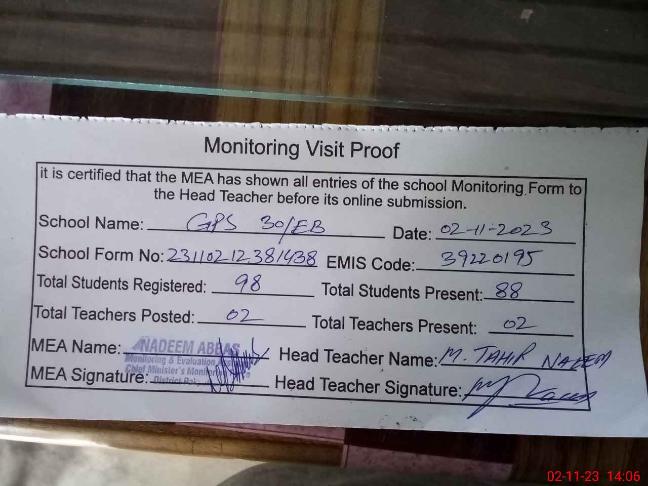 | Certified that this School was Inspected by the Undersigned MEA/DMO Today and the Information Stated Above is as Per Record. | |||||