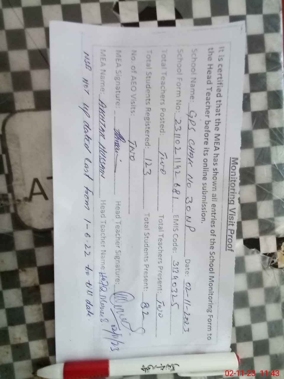 | Attendance Register | Head Teacher | MEA with School | Visit Proof |