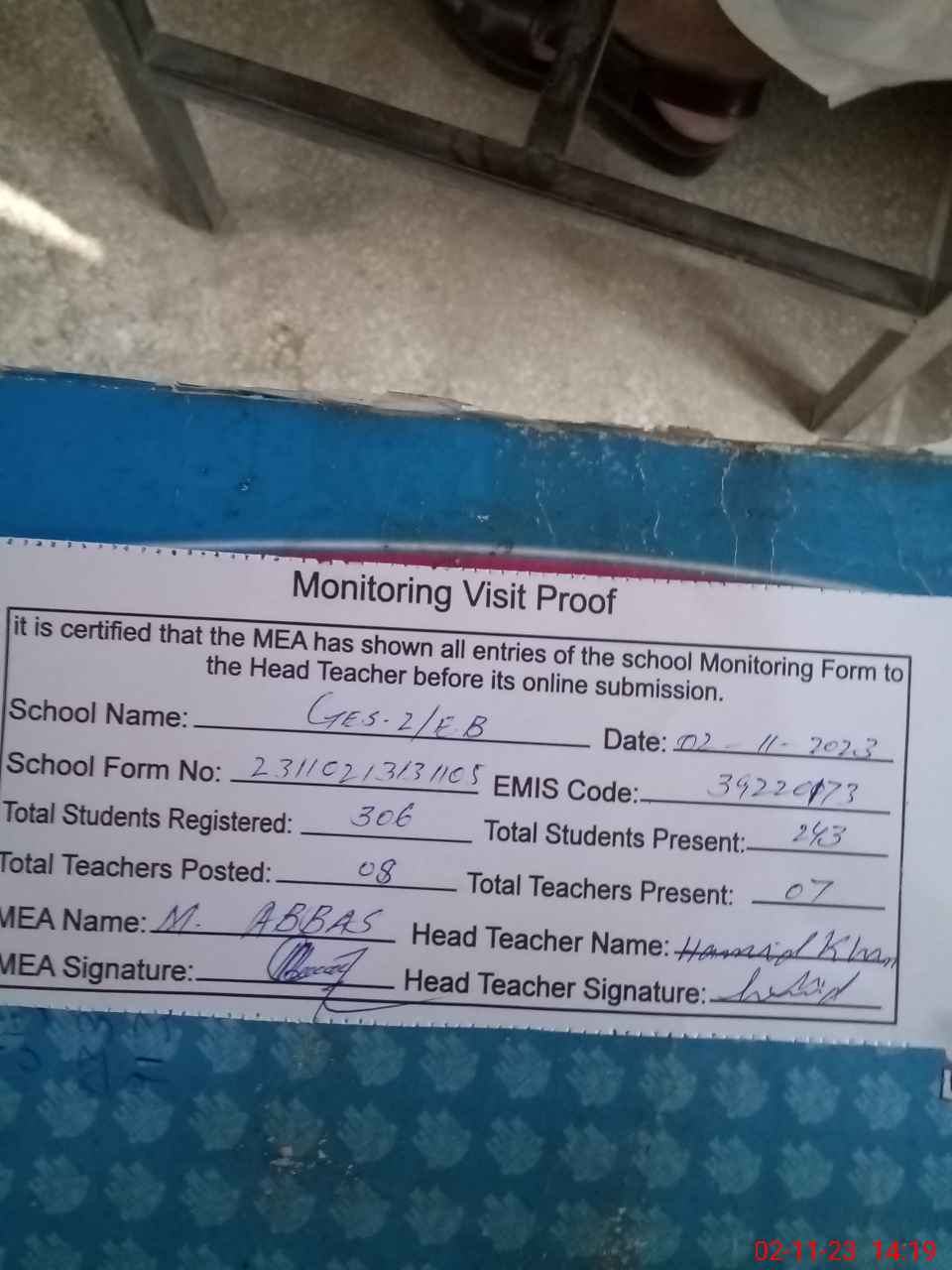 | Attendance Register | Head Teacher | MEA with School | Visit Proof |