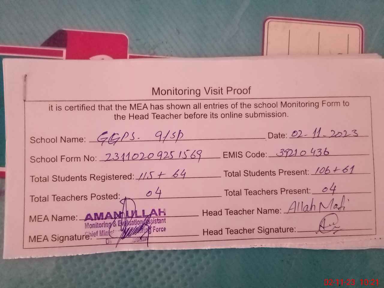 | Attendance Register | Head Teacher | MEA with School | Visit Proof |