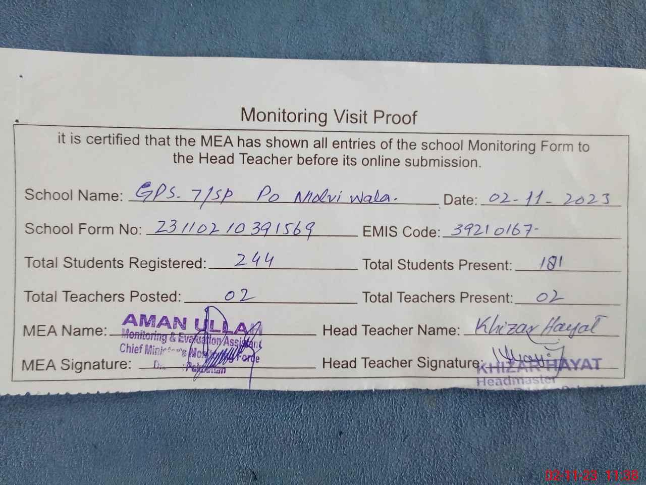 | Attendance Register | Head Teacher | MEA with School | Visit Proof |